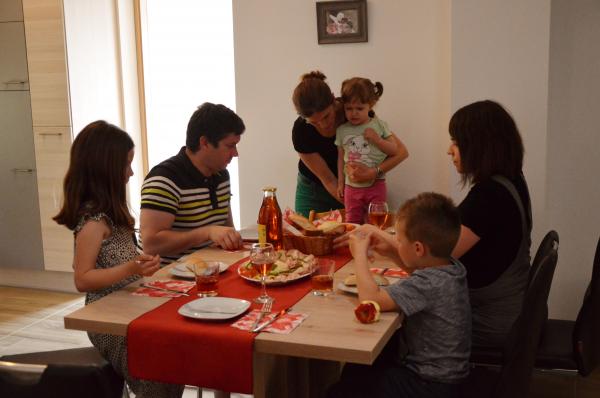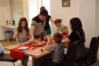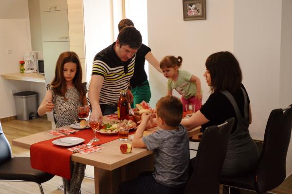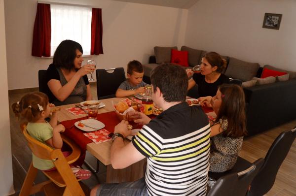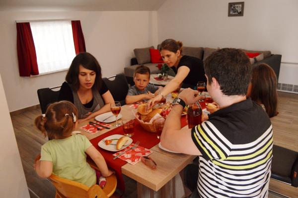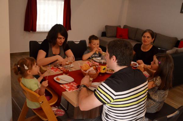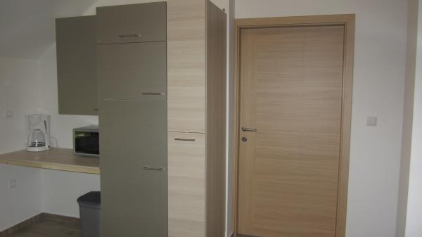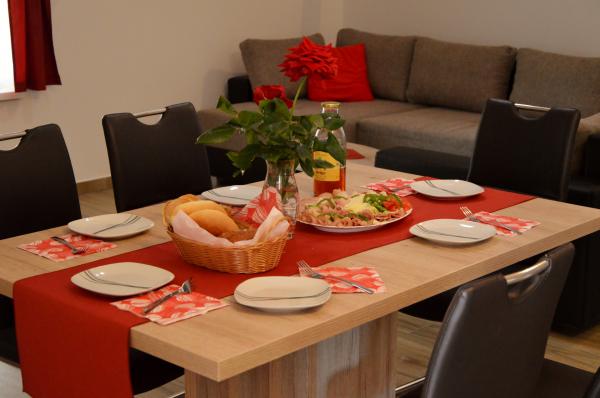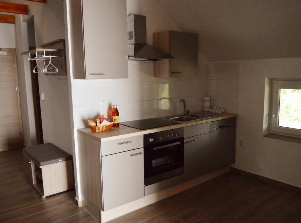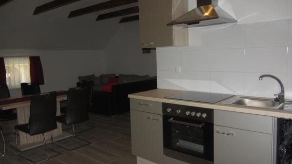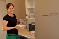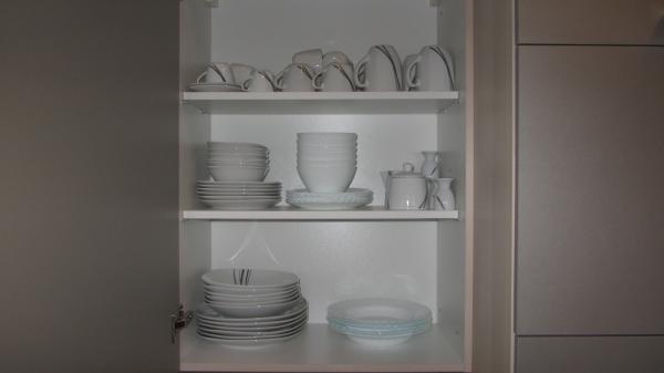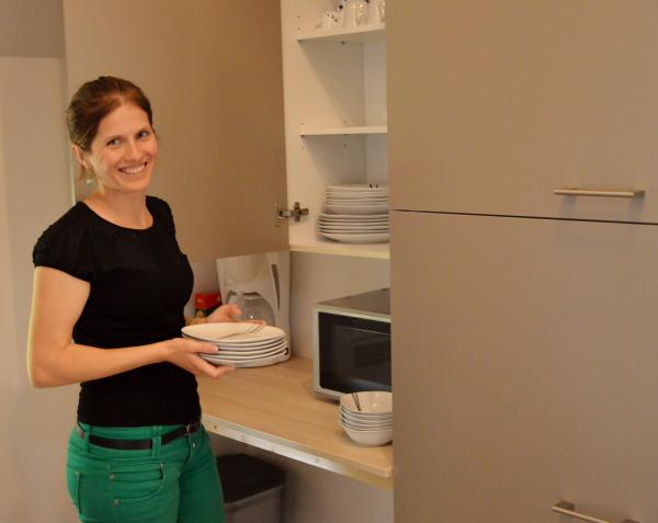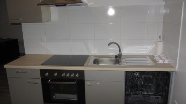 - Komplett eingerichtete Küche für 8 Personen (mit besteck, Tellern, Mikrowelle, Kaffeemaschine ...) mit Backoffen, Glaskeramikkochfeld,