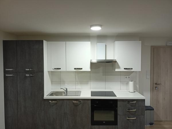 - ausgestattete Küche mit Herd, Backofen, Geschirrspüler, Kühlschrank mit Gefrierfach
